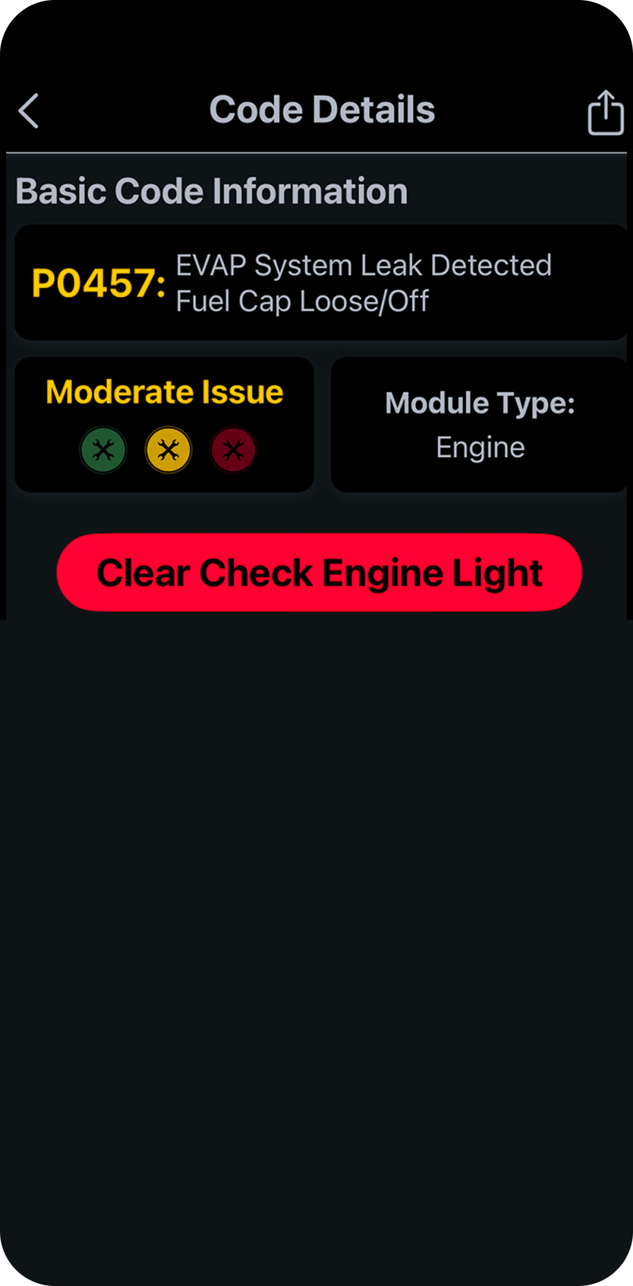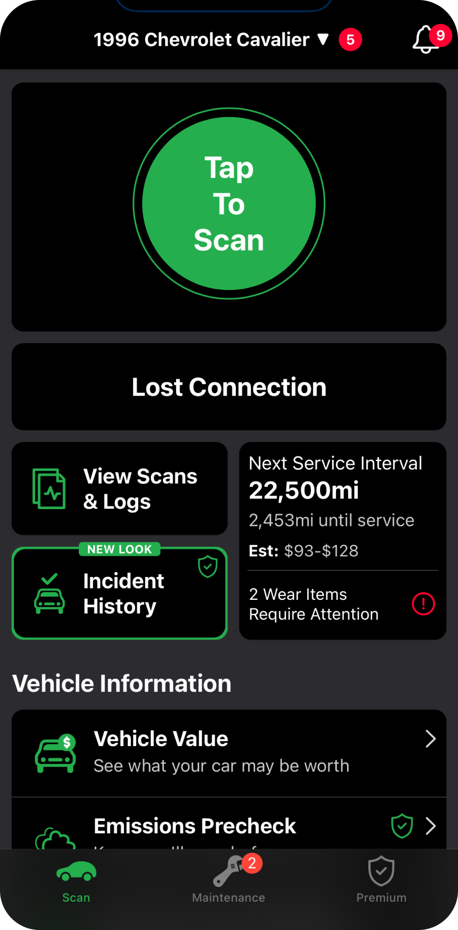 Clear check engine lights with the touch of a button and keep a record of past vehicle scans inside the FIXD app.