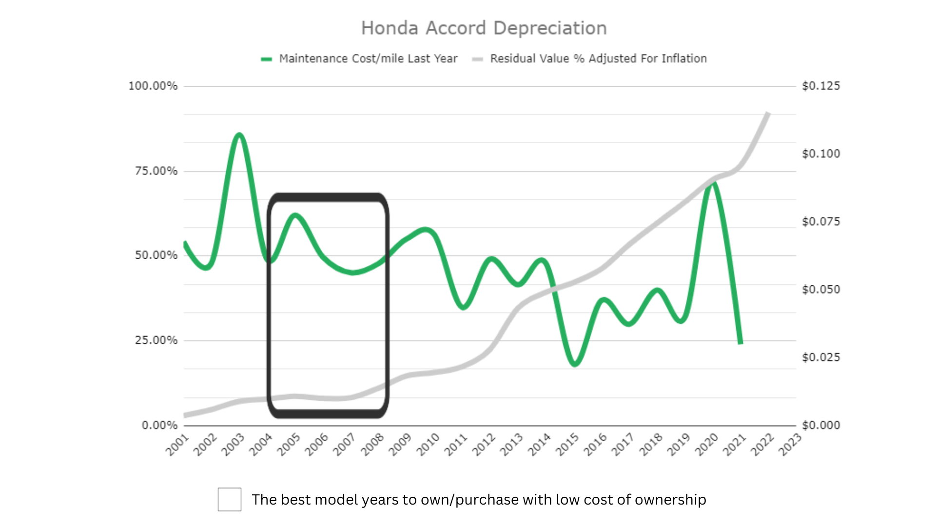 The chart you see above shows the approximate depreciation for a Honda Accord. The figures, which are based on Kelley Blue Book data beginning in 2001, assume an Accord in standard trim, a mileage of 12,000 per year, and a generic color such as black or white.