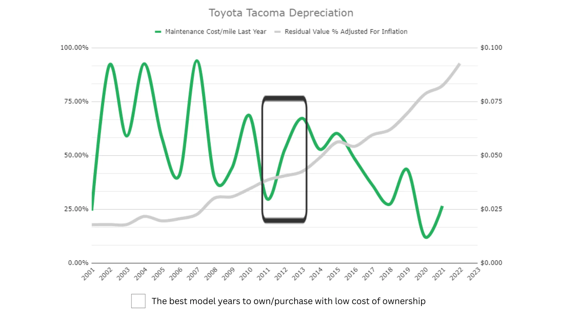 When you account for depreciation, we recommend purchasing a 2011-2013 Tacoma. That’s the depreciation sweet spot for this vehicle. These model years also have high ownership ratings and a low chance of needing costly repairs.