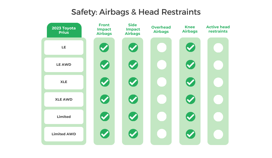 Neither the Prius nor the Civic comes with overhead airbags. This newer technology replaces traditional front-row units (steering wheel and dashboard) with overhead devices. Active head restraints are usually found in specialty and high-end vehicles to minimize whiplash injuries. Mainstream cars like the Prius and Civic aren’t usually equipped with this feature.