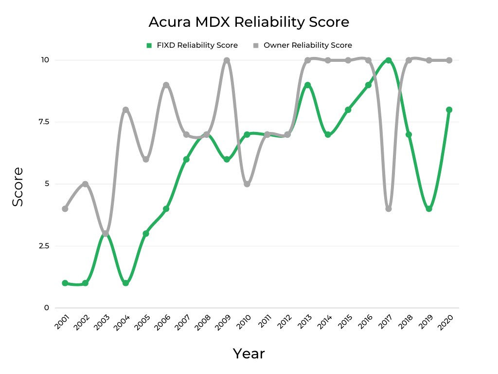 The Owner Reliability score of the 2010 Acura MDX is 5 out of 10, while the 2011 MDX does better at 7 out of 10. With the FIXD Reliability score of both the 2010 and 2011 MDX models is 7 out of 10.