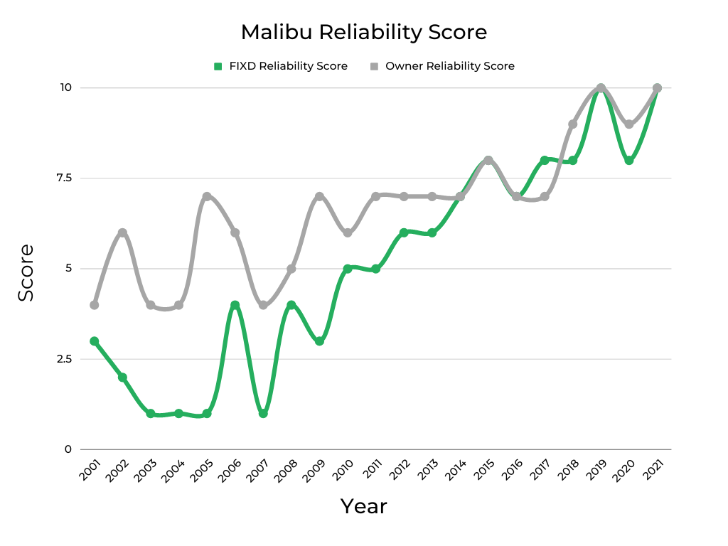 - Owner Reliability Score & Data: This data is the result of surveying Chevrolet Malibu owners who use FIXD.