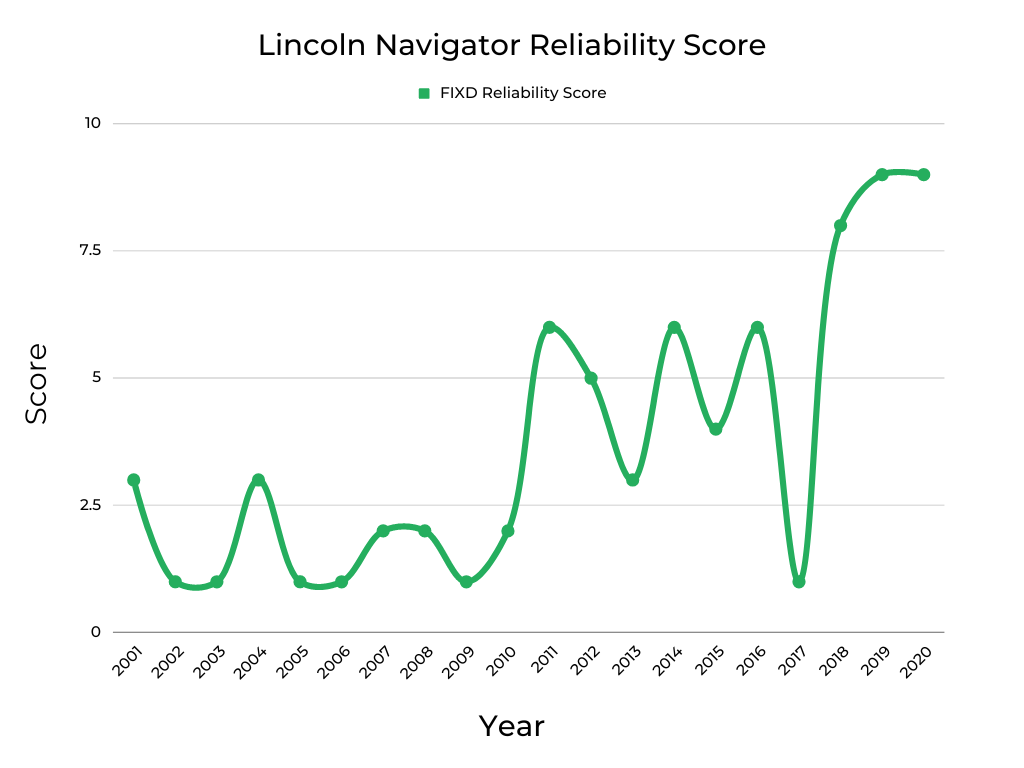The graph highlights the FIXD Reliability Score for Lincoln Navigators from 2001-2020. This is a measurement, which is weighted by mileage, to check engine light frequency in Navigators with a FIXD sensor. 10 indicates the best possible score, with one being the worst. 5 is average.
