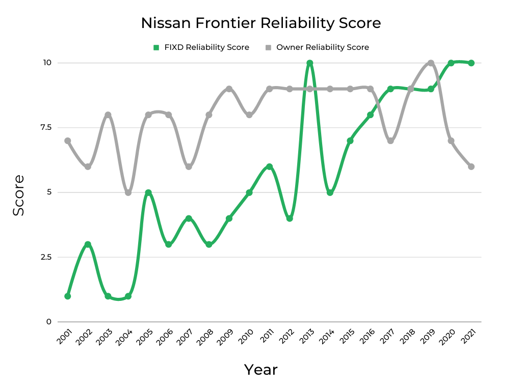 - Owner Reliability Score & Data: This data results from surveying Nissan Frontier owners who use FIXD.
