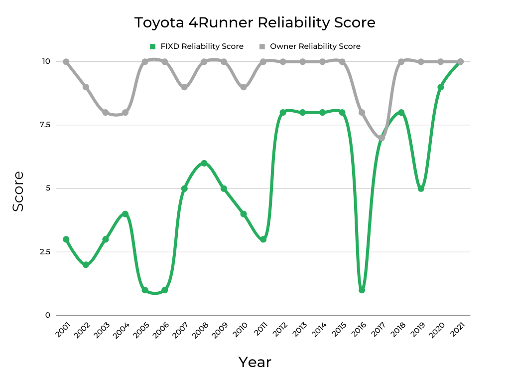 - Owner Reliability Score & Data: This data is the result of surveying Toyota 4Runner owners who use FIXD.