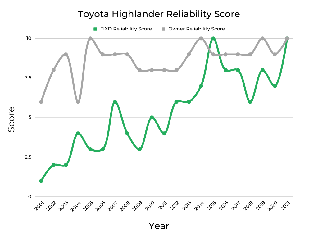 - Owner Reliability Score & Data: This data results from surveying Toyota Highlander owners who use FIXD.