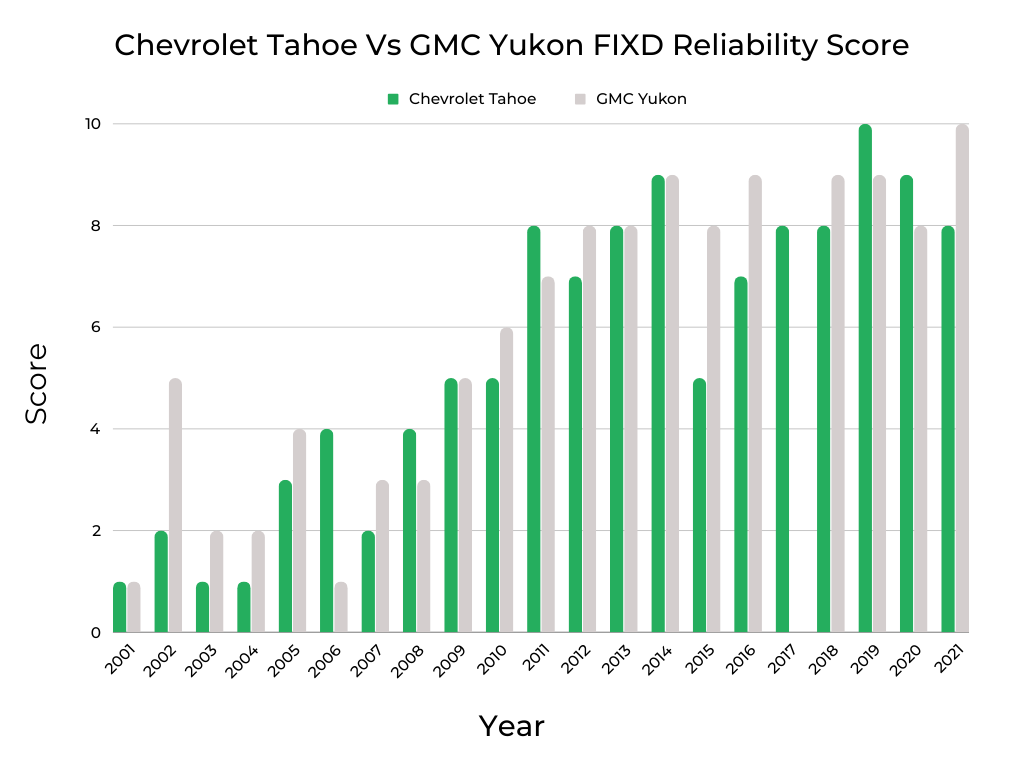 Instead, there are only four Tahoe-Yukon pairs with the same rating. In addition, eleven model years have a score difference of one, and five years have a score gap of two or more. Getting further into the details shows that the Yukon comes out ahead for ten years compared to five years for the Tahoe.
