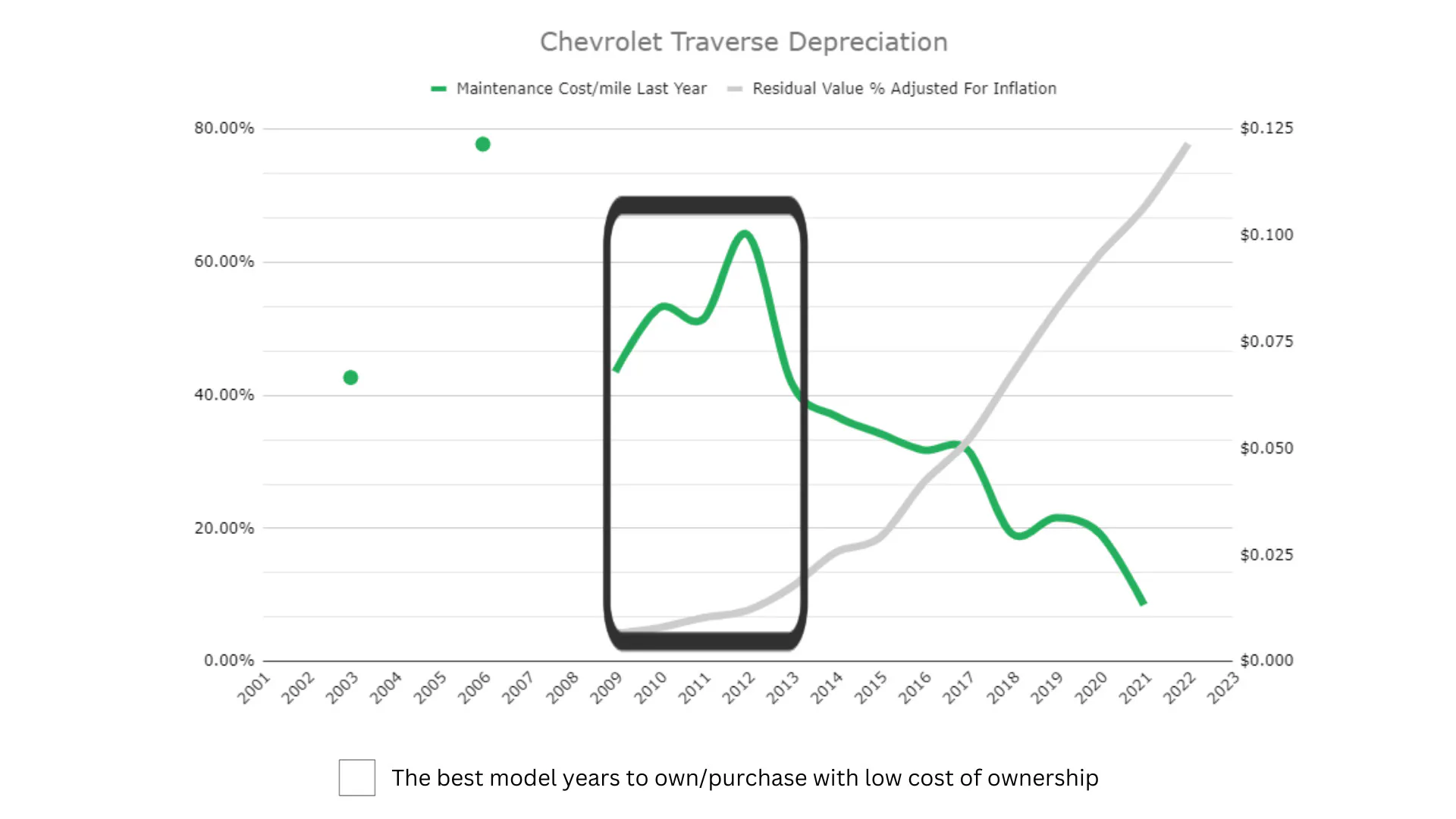 The combination of low residual value and low maintenance costs starts in the 2009 model year for the Traverse and continues through 2013. Buy anything newer, and you won’t be maximizing the depreciation opportunity.