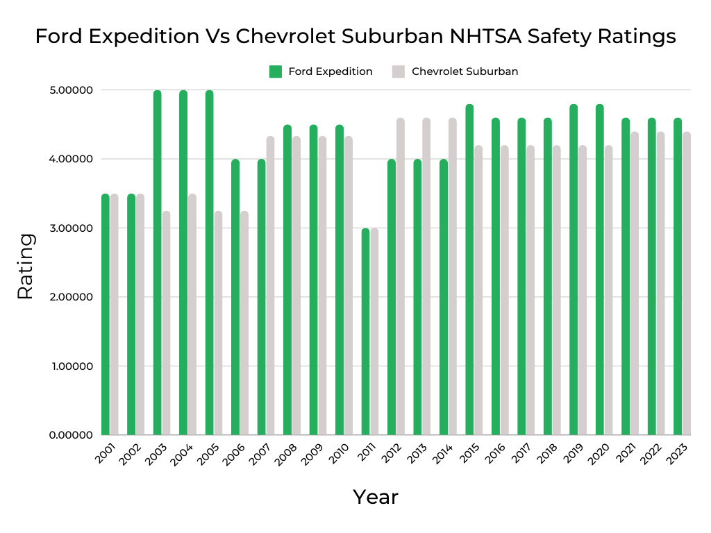 Specifically, the Ford has a better average safety score than the Chevy 16 times in 23 years and has been out in front since 2015. The Suburban had especially low safety ratings between 2001 and 2006, and 4 of those model years got a thumbs down on the best and worst rankings.