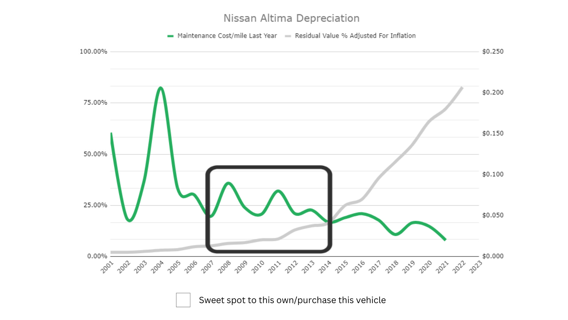 It’s an area that takes as much advantage of depreciation as possible while aiming for relatively low upkeep costs per mile of ownership. For the Nissan Altima, that sweet spot is between 2007 and 2014, a range that has residual values no greater than 15% and maintenance costs of between 5 and 8 cents per mile.