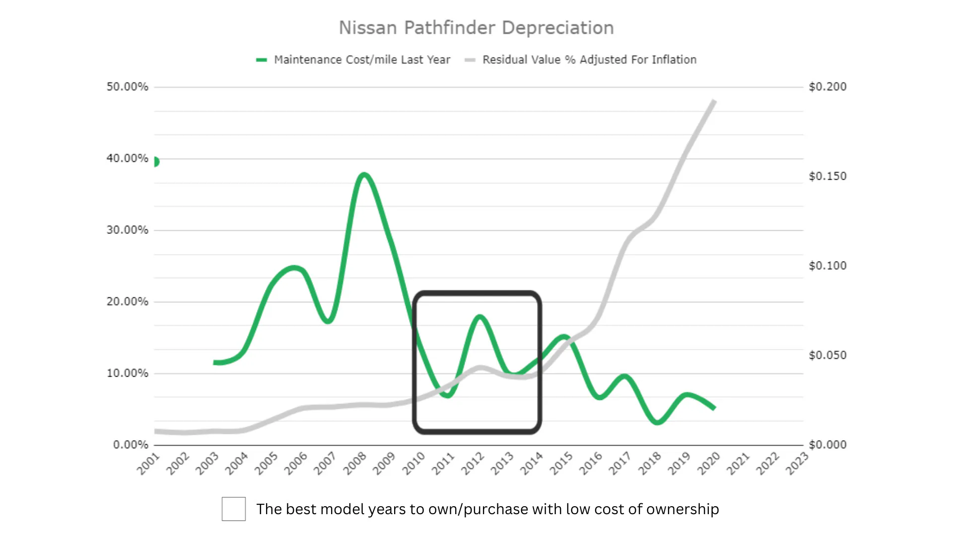 The ideal Pathfinder model years are 2010-2014. It’s a narrow window but reflects the only examples that balance significant depreciation with moderate upkeep costs. To the Pathfinder’s favor, this “sweet spot” is more recent than the better buys for the Highlander.