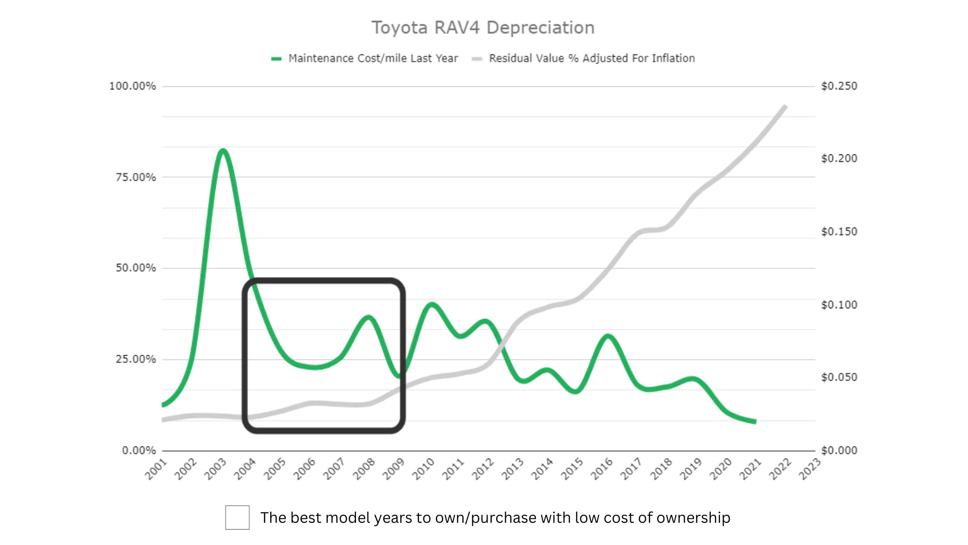 Model years in the red fall into the worst category, those that are green we consider the best years, and yellow is for model years we don’t have enough data on yet. Were you to overlay our depreciation “sweet spot” chart with this timeline, you’d find that only the 2009 RAV4 is in that zone and in the green above.