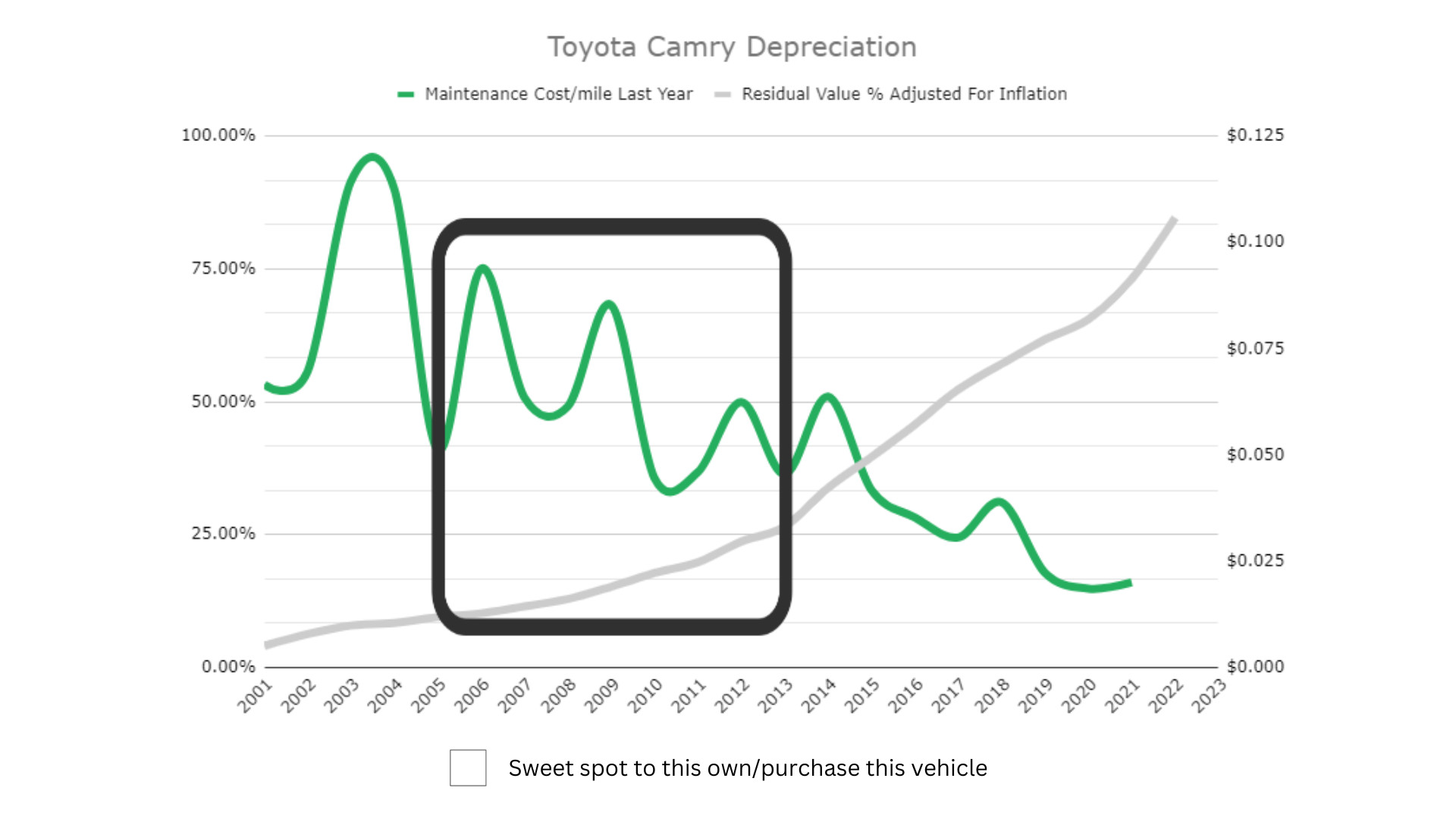 As indicated by the black box on each chart, you can see that the 2005 to 2013 Camry and 2004 to 2009 RAV4 occupy this Goldilocks zone of used car buying. Not TOO many miles and not TOO expensive to maintain, these respective model year ranges are JUST right.