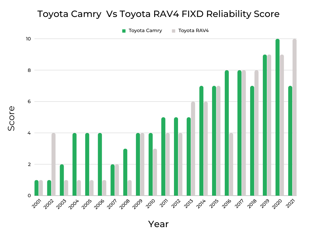 Bolstering the trend of the Toyota Camry offering a better overall value than its RAV4 platform-mate is the FIXD Reliability Score comparison chart above. Over 21 years, the Camry has objectively higher reliability than the RAV4 11 of those years, or more than 50% of the time.