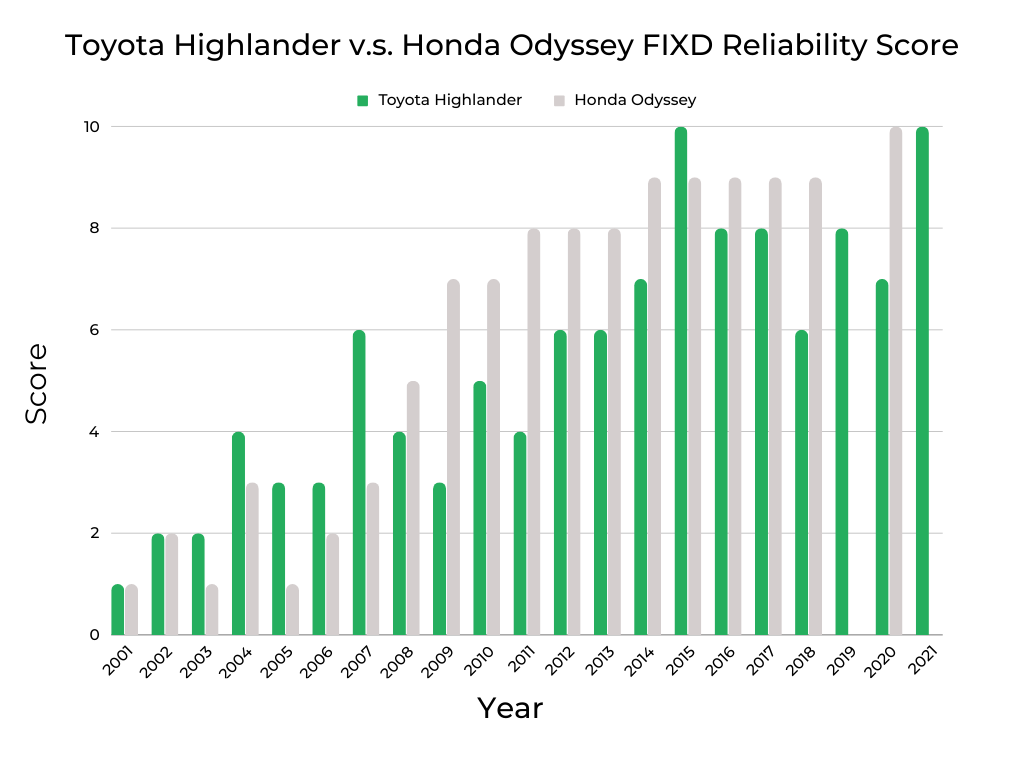 Review the Best and Worst Years articles on the Toyota Highlander and Honda Odyssey to learn more about these vehicles’ FIXD Reliability and Owner Reliability Scores.