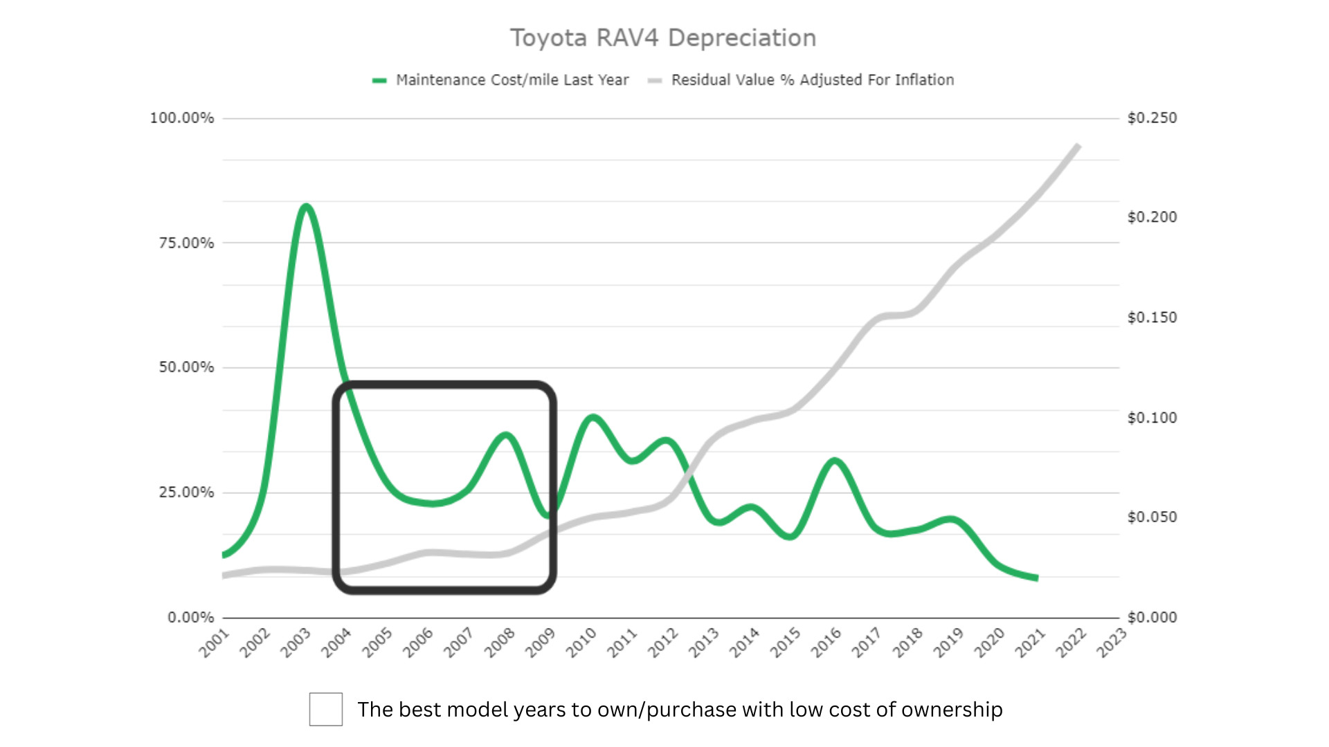 As for making a purchase decision, note that the 2009 RAV4 is both in the green above and within the depreciation sweet spot from earlier. For the 4Runner, the 2003 and 2004 model years meet this criteria.