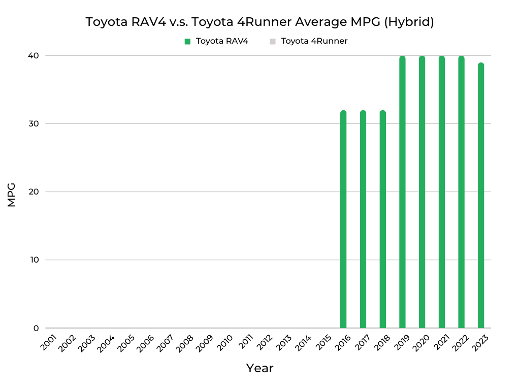 Need even more fuel efficiency? Check out the RAV4 hybrid chart above on the right. Since 2016, it has offered this powertrain, something the 4Runner never has. As of 2019, these fuel misers have averaged an impressive 40 mpg.