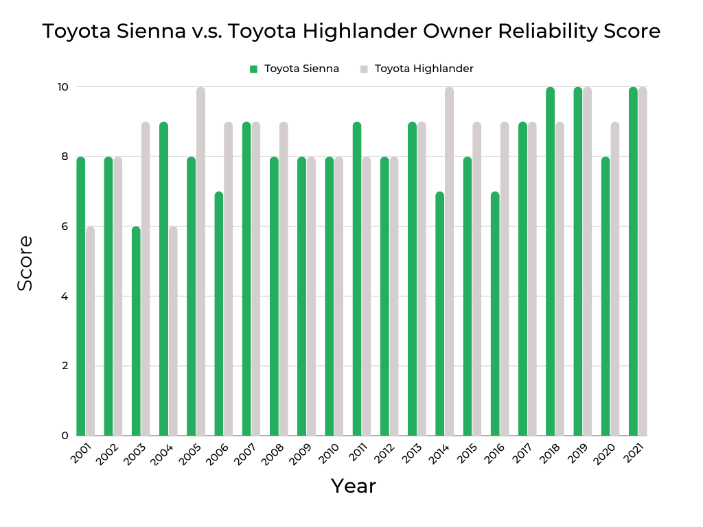 That’s because roughly half of those 21 model years, the Sienna is more reliable with the other half going to the Highlander. There are a few years where these figures are identical.