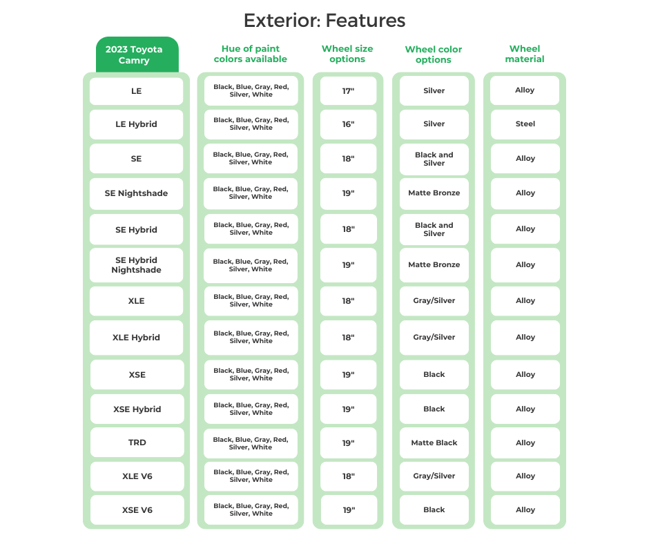 At the same time, some Camry trims have no equivalent (or anything close) in the Accord lineup. This centers on the Camry’s available V6. We’ll get into more details later on about engines, but it’s worth mentioning how unique the V6 is in this class.