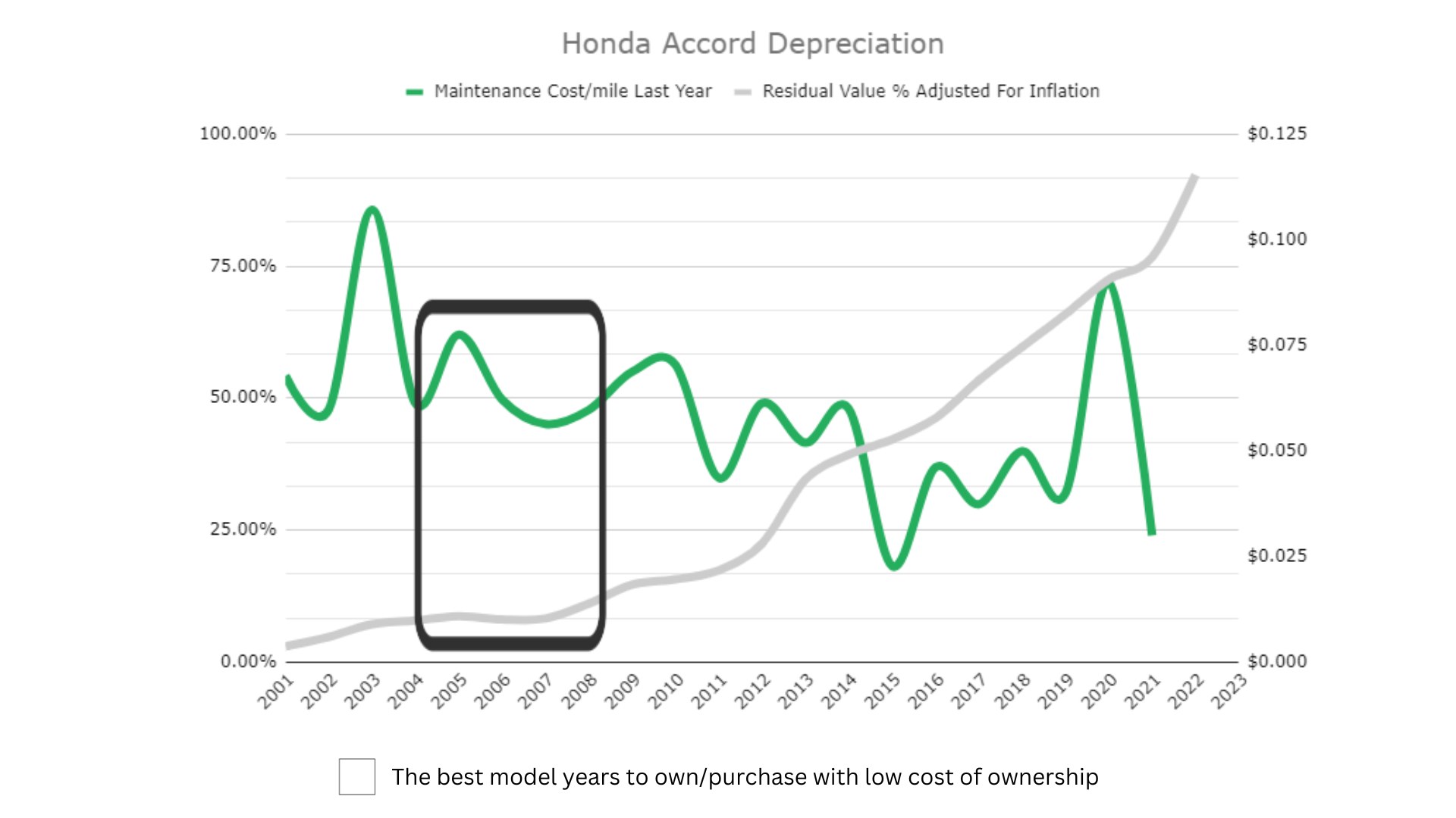 Used car buyers are always concerned with price, whether out of budgetary necessity or frugality. The graph details costs for used Honda Accords and Toyota Camrys, based on Kelley Blue Book (KBB) data from 2001-2021 model years. These numbers reflect average private-party transactions. If you go the retail route, expect to pay 10%-40% more at a dealer. If you can’t deviate from a specific budget limit, shop for an older example.