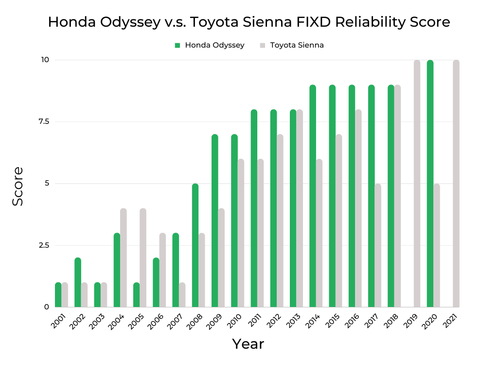 Yet, the Odyssey and Sienna get closer once again with Owner Reliability Scores. The Honda gets better ratings for 8 out of 19 years, compared to 4 years for the Toyota. Both vehicles were tied for seven years.
