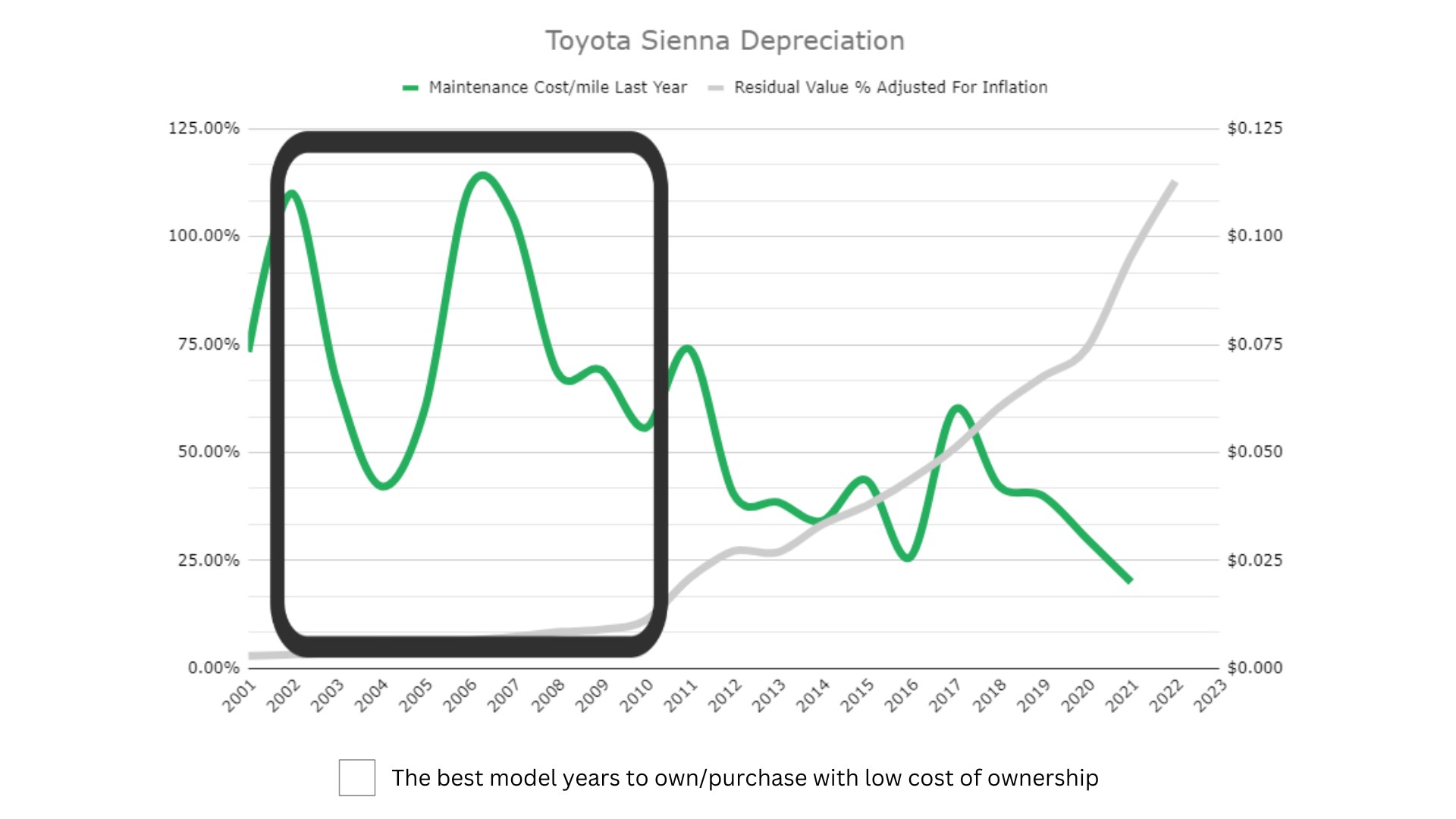 A decrease in value is less of a factor with older cars—wise car shoppers look for this. Someone else has already taken the depreciation “hit.” But just buying any old car won’t do. The secret is also finding a vehicle with a history of reasonable repair costs. This combination of low depreciation and reasonable upkeep expenses is the “sweet spot” marked by the outlined boxes in each graph. These are the model years to target for older Honda Odysseys and Toyota Siennas.