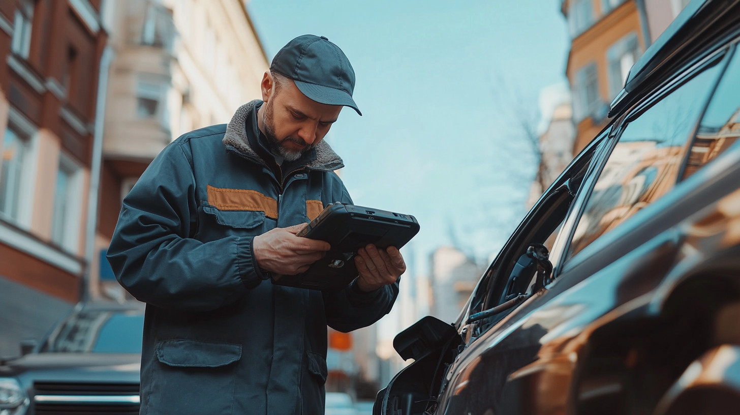 Car Mechanic scanning a vehicle at a city street