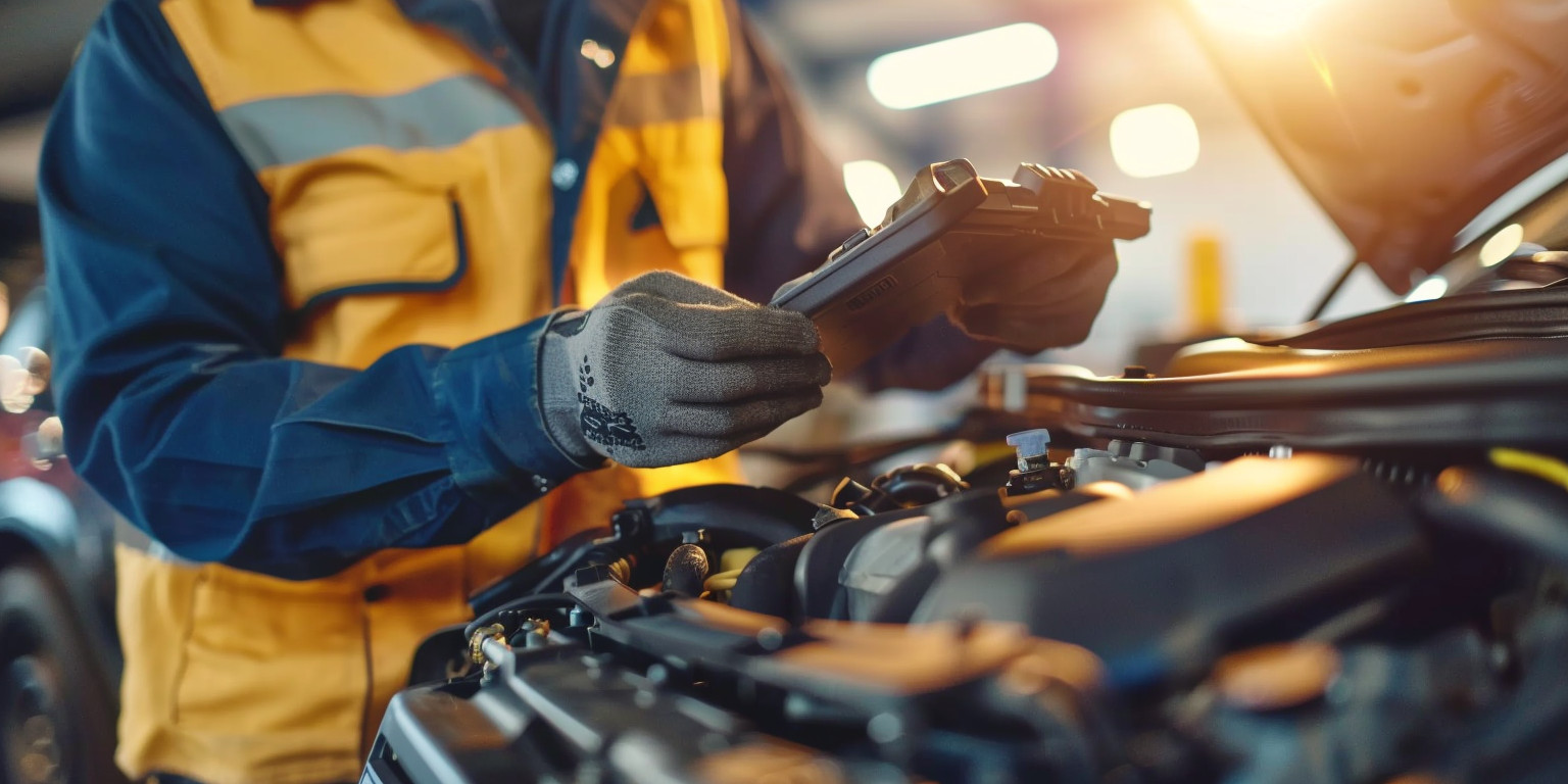 A car mechanic scanning a car engine